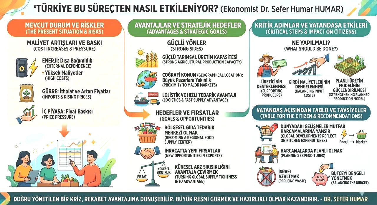 Ekonomist Dr. Sefer Humar: Türkiye’ye baktığımızda durumu dengeli bir biçimde analiz etmek gerekiyor. Evet, enerji ve gübrede dışa bağımlılığımız nedeniyle maliyet artışlarından etkileniyoruz. Bu durum yerel piyasalardaki fiyat baskısını artırıyor. Ancak Türkiye’nin bazı önemli avantajları da bulunuyor.