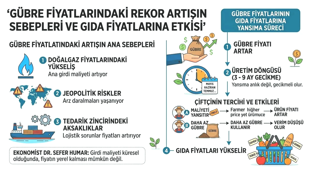 | Gübre Fiyatlarındaki Yükselişin Gıdaya Yansıması | Gübre fiyatlarındaki artış, gıda fiyatlarına etkisini zamanla gösterir. Genelde, bu süre 3 ila 9 ay arasıdır. Çiftçiler maliyetleri ya azaltmaya çalışır ya da üstüne koyar; bu durum, hem verim kaybına hem de fiyat artışına neden olur. | Ekonomist Dr. Sefer Humar |